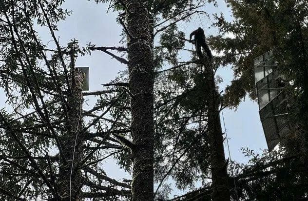 幸而合作方提供了巨大的帮助,在徐驰等人尝试安装 Starlink 天线传输声呐数据时,由于树荫遮蔽无法收到良好的网路信号,为了在树顶固定天线,合作方的专业成员排除万难爬上近 50 米高度的云杉树。