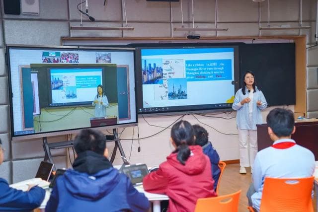 在求真中学教师王佳蓉、顾毓婷带来英语地理跨学科同侪课上,英语学习与地理知识巧妙融合。学生们的任务是运用刚刚学习的写作技能,向英国的朋友介绍黄浦江。