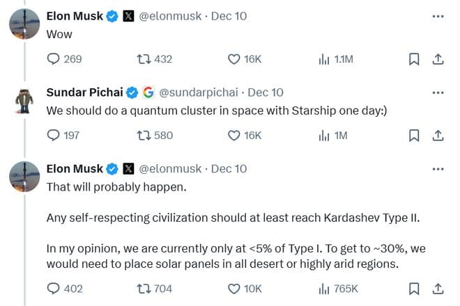 对此,谷歌CEO皮查伊在X(原推特)上发布了Willow芯片的介绍,引来了马斯克的点赞。在皮查伊回复“我们应该用星舰在太空中建立一个量子集群”后,马斯克表示“确实如此”。