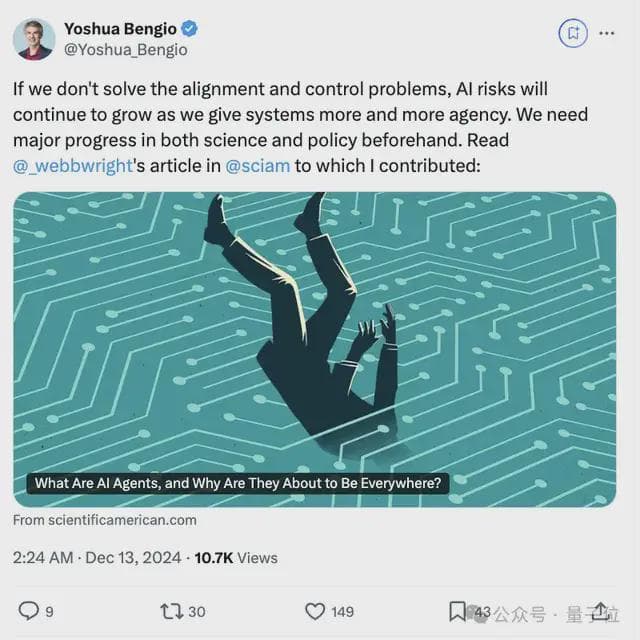 而就在刚才,Bengio还进一步回应了,再次强调了AI Agent潜在的风险。