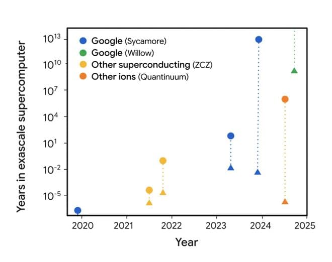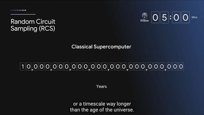 而这一次,Willow 在算力测试中,进一步将理论算力差距拉大到了天文数字的级别。此次 Willow 用 5 分钟完成的计算任务,如果用普通的超级计算机,需要 10^25 年,比宇宙的寿命还长。
