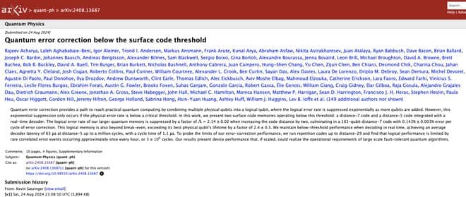 这是自计算机科学家 Peter Shor 1995 年提出“量子纠错”概念以来的一次重大突破。根据谷歌发表的论文,如果未来进一步将量子比特增加,错误率将会指数级下降,降到 10^-10 量级。