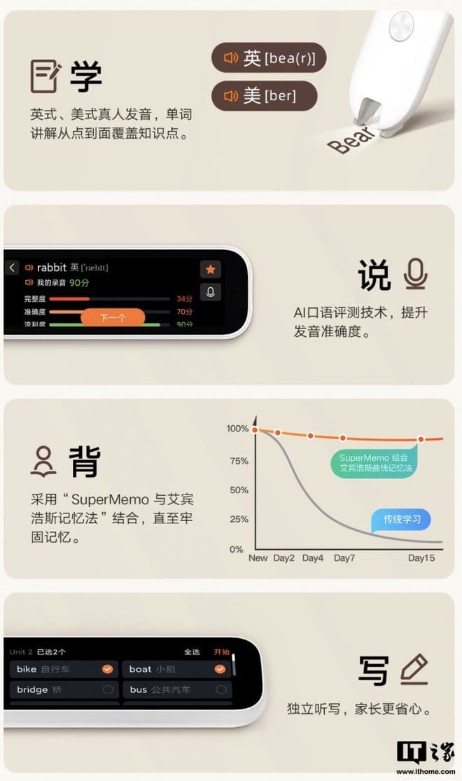 此外,该词典笔号称集成科学学单词方法,覆盖自然拼读、单词巧记、强化记忆、艾宾浩斯、SuperMemo五种方法,帮助用户掌握单词,同时配备的扫描头支持 0.3 秒快速识别,采用高帧率连拍技术 + 视觉神经网络芯片,号称识别字准率 98% 以上。