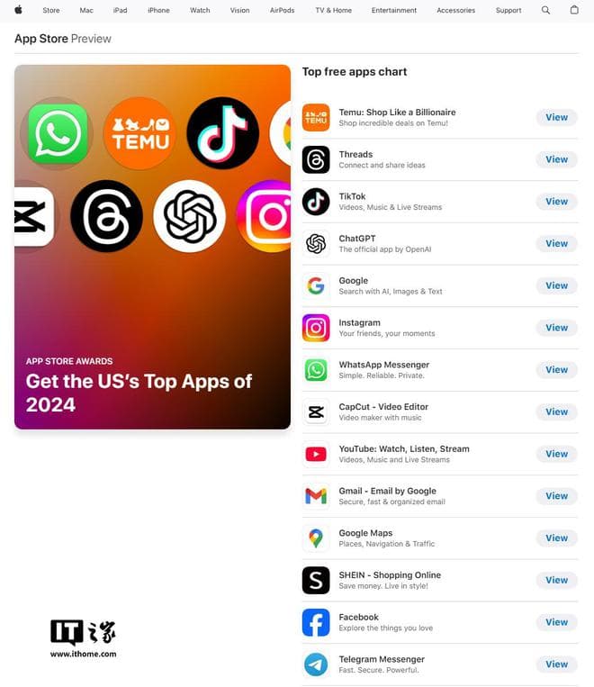 IT之家 12 月 17 日消息,据苹果公司周一发布的 App Store 年度应用和游戏下载排行榜显示,中国购物应用 Temu(拼多多旗下跨境电商平台)再次蝉联美国免费应用下载榜冠军。自去年首次登顶并取代 TikTok 以来,Temu 已连续两年占据榜首位置。