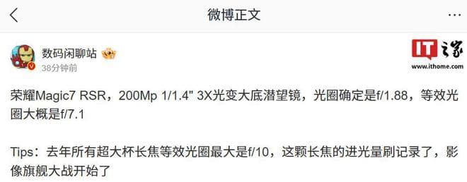 博主@数码闲聊站 今日发文透露,荣耀Magic7 RSR 保时捷设计手机配备 200Mp 1/1.4" 3X 光变大底潜望镜,光圈为 f/1.88、等效光圈大概是 f/7.1。博主还补充“去年所有超大杯长焦等效光圈最大是 f/10,这颗长焦的进光量刷记录了”。