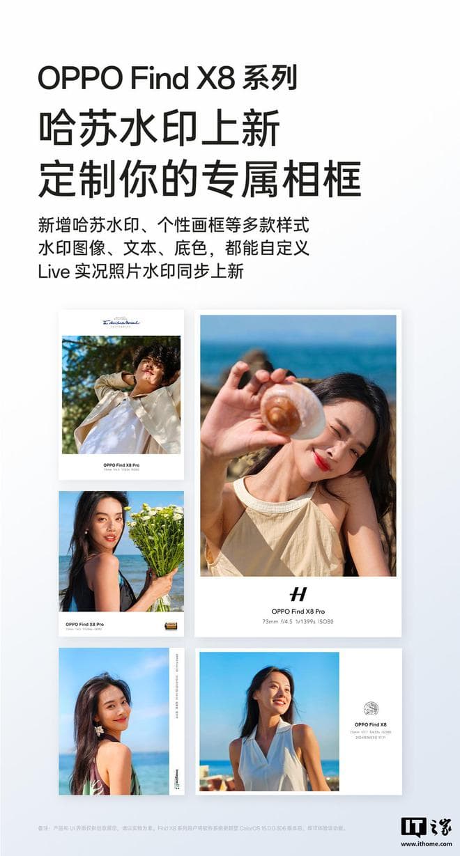 IT之家 12 月 20 日消息,OPPO 今日宣布 Find X8 系列手机哈苏水印上新,水印图像、文本、底色,都能自定义,Live 实况照片水印也支持定制。IT之家注:Find X8 系列用户将软件系统更新至 ColorOS 15.0.0.306 版本后。