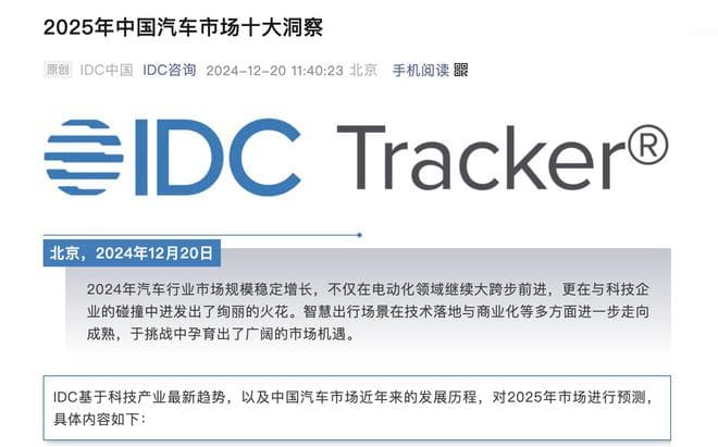 12 月 20 日,IDC 基于科技产业最新趋势,以及中国汽车市场近年来的发展历程,公布了 2025 年中国汽车市场十大洞察。