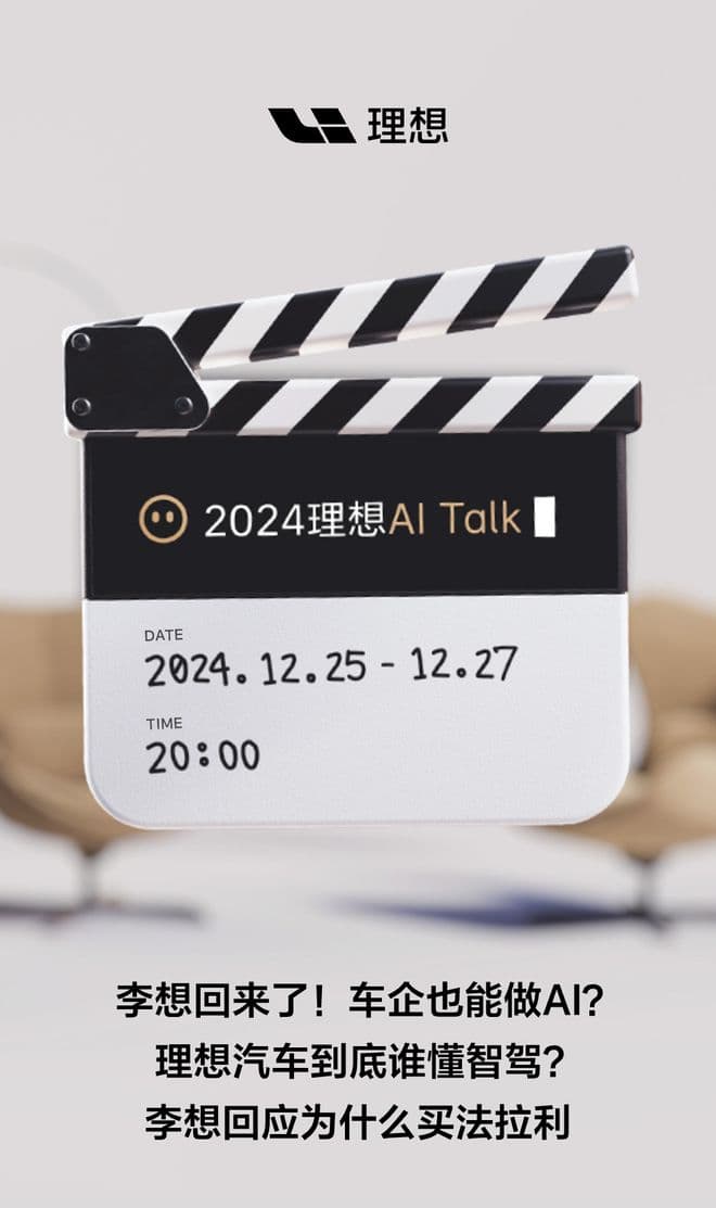 12 月 20 日,理想汽车官方宣布,将于 12 月 25 日至 12 月 27 日,举行「2024 理想 AI Talk」直播,届时理想汽车 CEO 李想将出镜直播。
