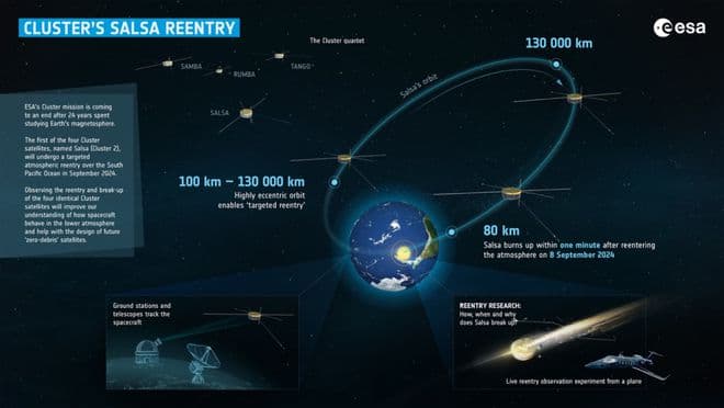 这颗卫星名为 Salsa,属于欧洲航天局“Cluster”星座的四颗卫星之一。自 2000 年初以来,Salsa 和其他卫星一直在研究地球磁场,但它的任务已宣告结束。几个月前,这颗航天器被设定进入了一条“死亡螺旋”,最终将在距离复活节岛海岸约千英里的高空中,在地球大气层内燃烧解体。