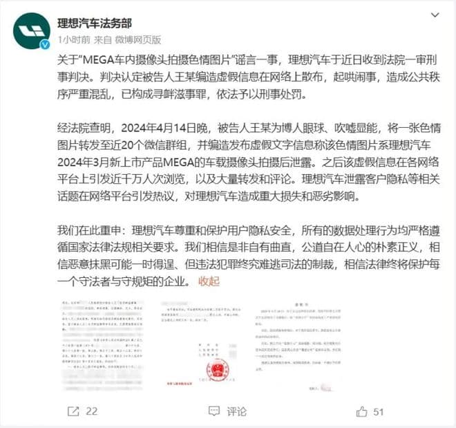理想汽车法务部:“MEGA车内摄像头拍摄色情图片”造谣者获刑七个月