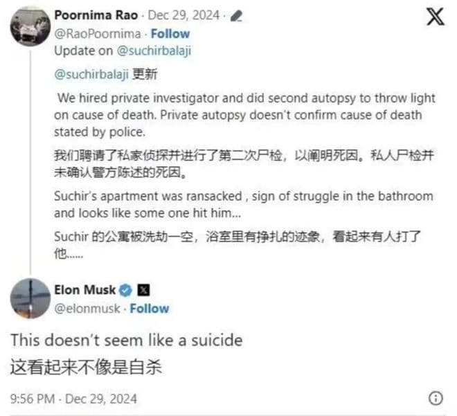 12月30日消息,26岁印度裔科技研究员、前 OpenAI 员工 Suchir Balaji 离奇死亡一案引起轩然大波,死者母亲 Poornima Ramarao 质疑警方结论,并要求联邦调查局 (FBI) 介入调查。马斯克也支持 Ramarao 女士的质疑,他在 X 上回应道:“这看起来不像自杀。”Ramarao 女士在社交媒体 X 上表示,她委托私人侦探进行了调查,并进行了第二次尸检,结果与警方认定的自杀结论不符。