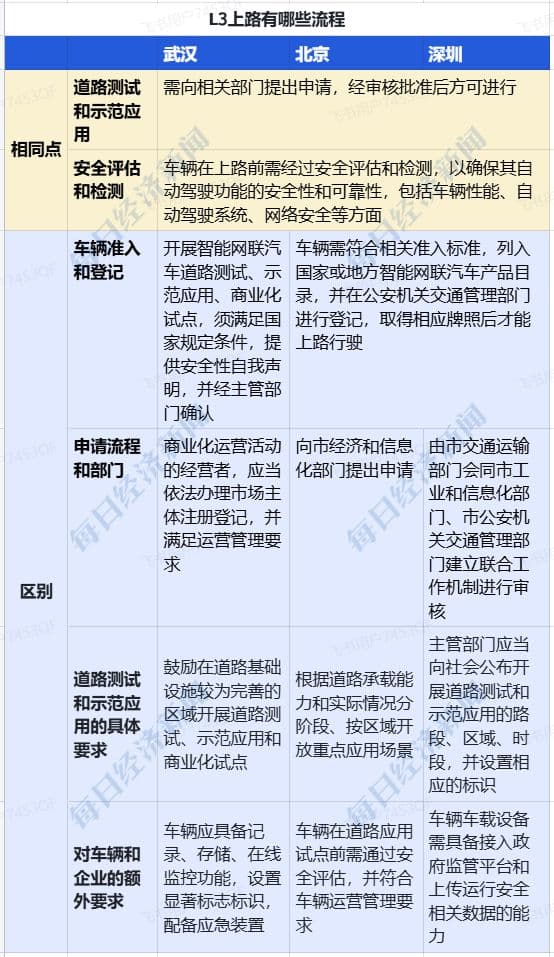 深圳、武汉和北京《条例》均要求,搭载L3级自动驾驶技术的车辆在上路前须进行道路测试和示范应用,须向相关部门提出申请,经审核批准后方可进行,但在申请流程、道路测试和示范应用的具体要求上,以及对车辆和车企的额外要求方面略有不同,如下表所示:
