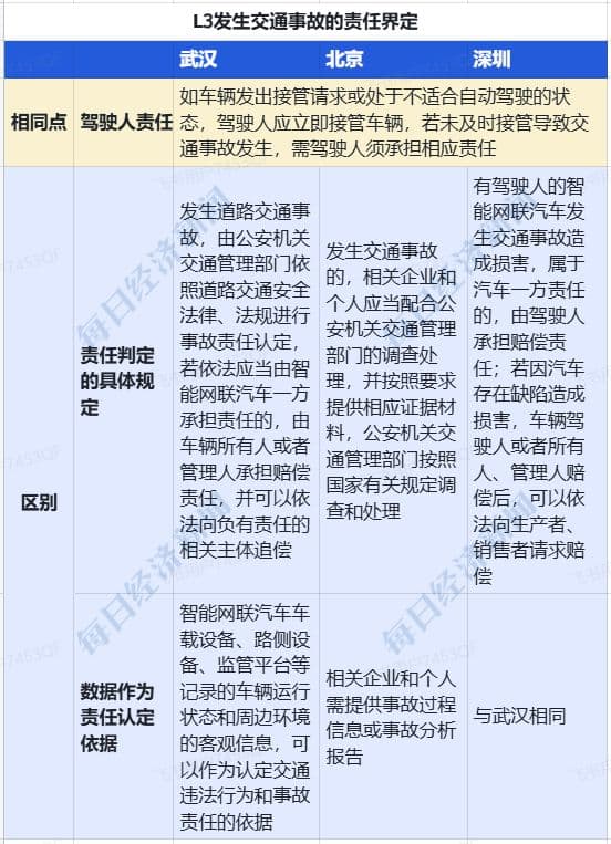 在深圳、武汉和北京三个《条例》中,智能网联车辆或自动驾驶车辆,都是指可以由自动驾驶系统替代人的操作在道路上安全行驶的汽车,包括有条件自动驾驶(L3)、高度自动驾驶(L4)和完全自动驾驶(L5)三种类型。而对于L3车辆申请上路流程、发生事故后责任如何界定等问题,三地《条例》有些许差异。