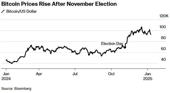 但在他最近的总统竞选中,特朗普转而成为加密货币的啦啦队长:7月在比特币2024年会议上的一次演讲使他的彻底转变成为可能。自他再次当选以来,由于市场预计即将上任的特朗普政府将推行支持加密货币的议程,加密货币价格飙升,尤其是比特币在去年12月创下了10.8万美元以上的历史新高。