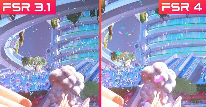 他们对比了FSR 3.1和FSR 4在4K分辨率性能模式下的画质,FSR 4在快速移动物体有了明显改进,而且拥有更好的色彩表现以及更强的透明元素渲染,这些都是此前历代FSR中表现不好的地方。虽然目前还无法与DLSS的画质相媲美,但FSR 4的画质改进是显而易见的。