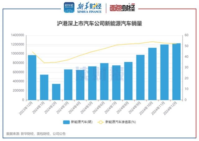 2024年12月,16家上市车企合计销售新能源汽车约122.87万辆,同比上升26.31%,当月新能源汽车渗透率约达52.13%,连续两个月出现下降。2024年,上述车企累计销售986.47万辆新能源汽车,同比上升32.62%。