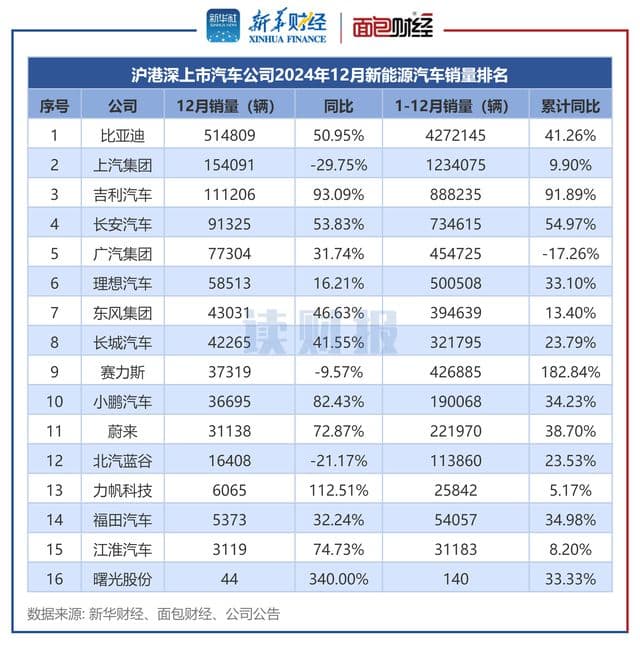 数据显示,比亚迪以51.48万辆位居行业第一,上汽集团、吉利汽车的12月新能源汽车销量均超过10万辆。增速方面,曙光股份、力帆科技的同比增速超过100%;上汽集团、北汽蓝谷、赛力斯分别同比下滑29.75%、21.17%、9.57%。
