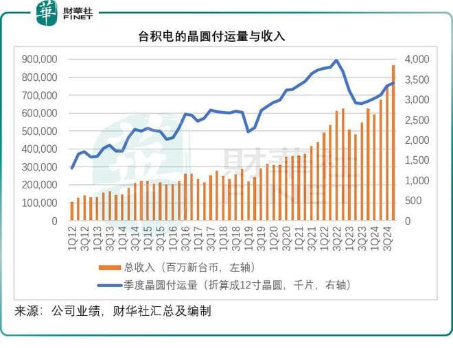 半导体代工服务供应商台积电(TSM.US)截至2024年12月末止第4季收入按年增长38.84%,至8,684.61亿新台币,处于其业绩指引的高位水平,其中季度晶圆付运量按年增长15.59%,至341.8万片(折算成12寸晶圆),其强劲的收入除了得益于付运量增长外,平均产品售价上升应是主因。