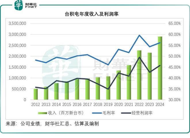 2024年全年,得益于3纳米和5纳米制程产品需求强劲,台积电的2024年收入达到2.89万亿新台币,按年增长33.89%;毛利率按年上升1.76个百分点,至56.12%,主要反映整体产能使用率的改善,抵消了3纳米制程摊释利润和电力成本增加的负面影响。全年经营利润率按年上升3.05个百分点,至45.68%。股东应占净利润按年增长39.92%,至1.17万亿新台币。