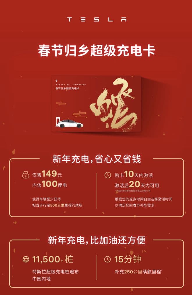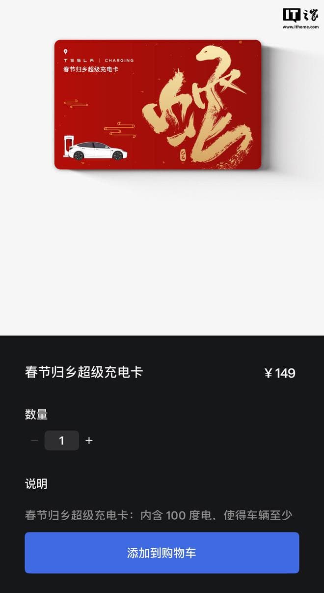 特斯拉春节归乡超级充电卡上线:每度 1.49 元,149 元