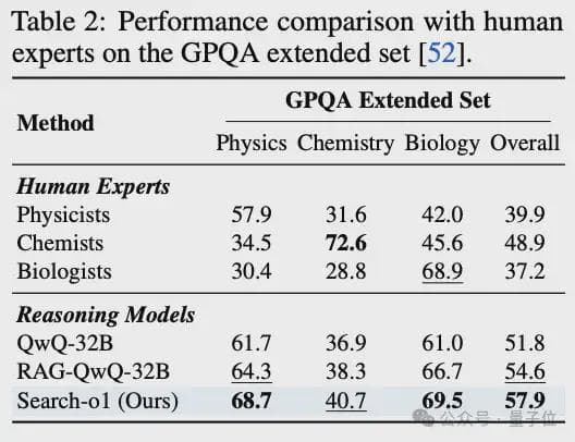 研究者将Search-o1的性能和GPQA扩展集中各个领域的人类专家进行了比较人类,下面的Table 2展示的是专家在物理、化学、生物等各个学科的人类专家成绩。