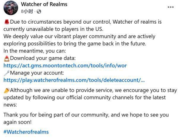 在《Watcher of Realms》的停运公告中,沐瞳表示:“由于不可控的情况,该游戏目前无法提供给美国玩家使用。我们非常重视我们充满活力的玩家社区,并正在积极探索未来游戏在美国重启的可能性。” 此外,沐瞳为美国玩家提供了下载个人游戏数据的链接地址,并提醒玩家妥善牢记自己的游戏ID和账号密码。根据玩家在社交媒体上展示的截图,《Mobile Legends:BangBang》《Marvel Snap》的停服公告内容也与上述公告内容相似。