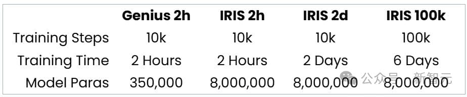 他们将Genius 10k/2h的性能与IRIS进行了对比,后者使用相同的1万步数据,但训练时间为2天(记为10k/2d)。
