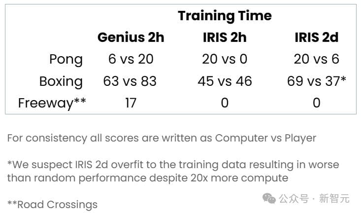 研究者在2小时内,用1万步游戏数据分别训练了Geniu和IRIS(记为10k/2h)。
