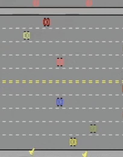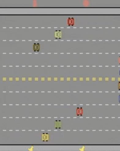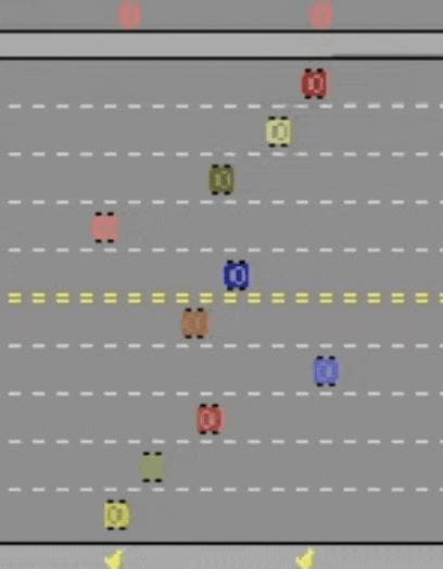 在Freeway游戏测试中,玩家需要控制小鸡穿过马路,同时避开来自不同方向、以不同速度行驶的汽车。