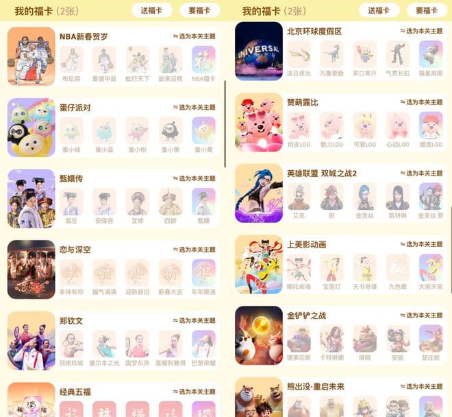 今年除了传统五福外,还有足足 28 套特色主题卡片可集。