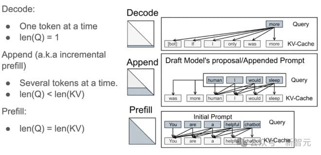 Prefill阶段拿到最开始的Prompt,填充kv cache;Decode阶段则是一个query计算出一个输出;存在多轮对话或者使用投机推理(Speculative Decoding)时,又可以有多个query向量并行计算。