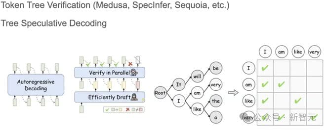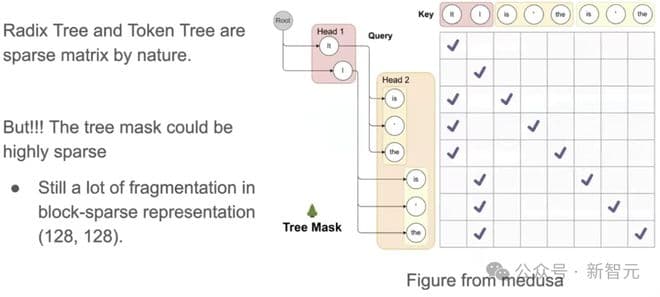 再看Speculative Decoding,多个草稿小模型生成的token序列通常组织成token tree的形式,表示成矩阵时是稀疏的。