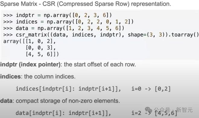 BSR跟通常用来存储稀疏矩阵的CSR(Compressed Sparse Row)很像,如下图所示,CSR只需存储矩阵元素的非零值、在行中的下标、以及每行的偏移。