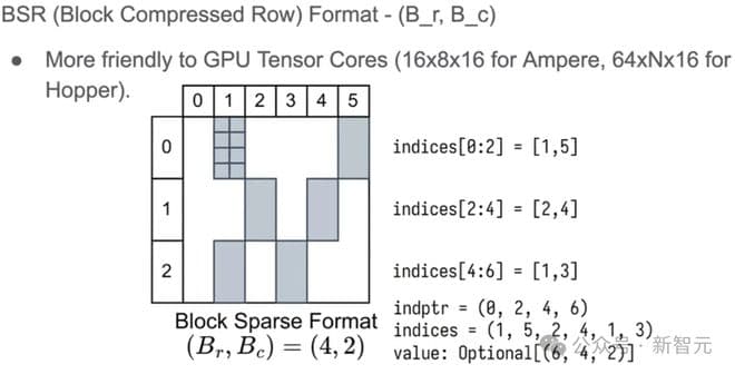 相同的存储方式,对应到BSR,只需将操作的最小单元由元素(单个数据)换成Block(一块数据),块大小为(Br,Bc)。
