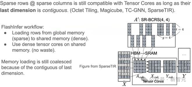 在FlashInfer中,系统从global memory中加载稀疏块数据,并在shared memory中将其排布成密集格式,tensor core可以直接计算这些数据,不会产生硬件的浪费。