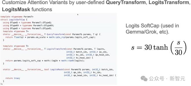 我们实际中接触到的各种LLM,会在算子中实现自己个性化的部分。受FlexAttention启发,FlashInfer提供了在Attention计算的不同阶段插入自定义函数的机制。