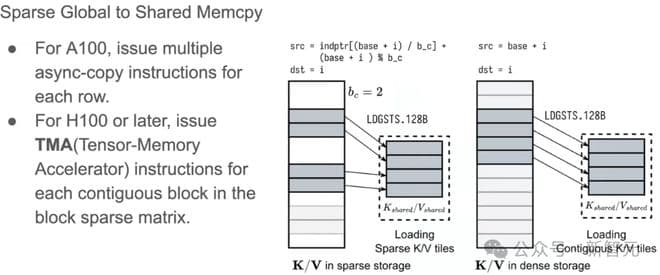 尽管Hopper架构中的TMA(Tensor Memory Accelerator)可以进一步加速数据移动,但它不支持非仿射内存访问模式,所以只在连续的情况下使用TMA。