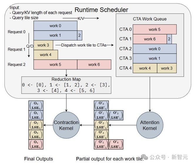 FlashInfer实现了高效的注意力合成算子,可以处理变长聚合。每个CTA的工作队列,以及部分输出与最终输出之间的映射,都由调度程序规划。