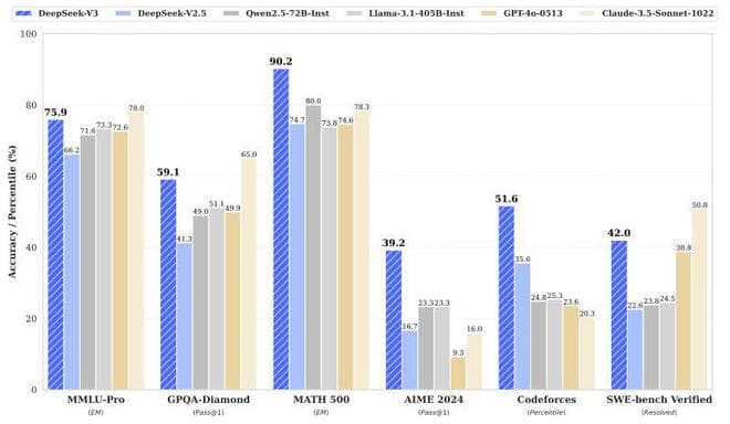当然,DeepSeek带来的最大震撼在于,如果中国公司能够以更低的成本实现同等或更好的性能,而且这些模型还大都开源,美国公司赖以维持的技术优势和高估值可能会受到挑战。