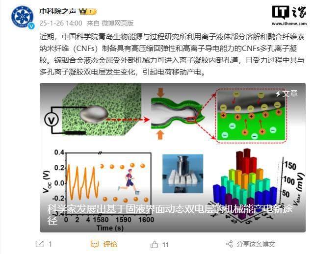 IT之家 1 月 26 日消息,针对微小型、可穿戴电子设备以及低功耗分布式传感器对自供能技术的需求,中国科学院青岛生物能源与过程研究所李朝旭团队开发出一种基于液态金属与离子凝胶界面的新型自供能器件。
