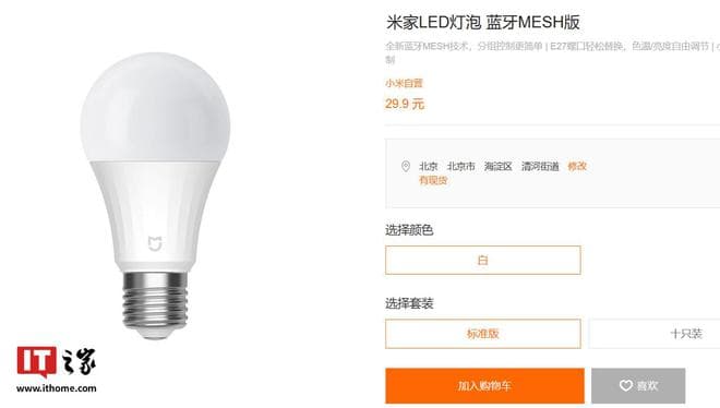 该灯暂未在国内发布,不过IT之家查询小米商城发现,国内有一款低配的米家 LED 灯泡(蓝牙 MESH 版),功率 4.5W,同样可调 2700K ~6500K 色温,但不能调节多种颜色,定价 29.9 元。