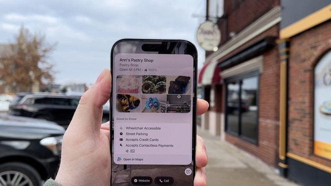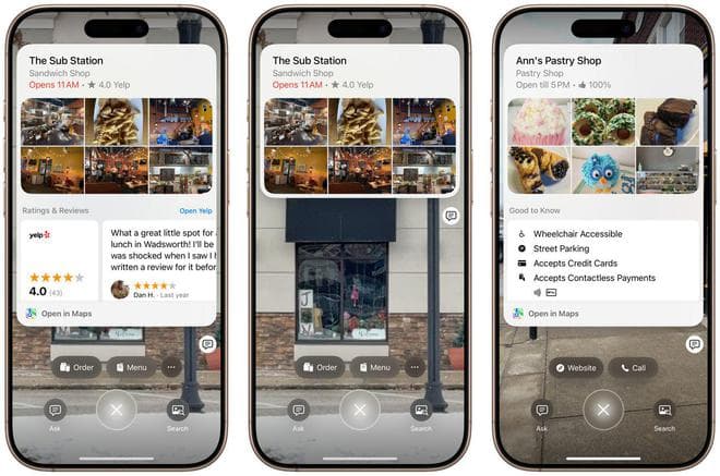 可以识别地标建筑并提供相关信息,显示商家的营业时间、网站、电话等,还能显示餐厅的菜单、照片、评价,并支持预订和在线点餐。