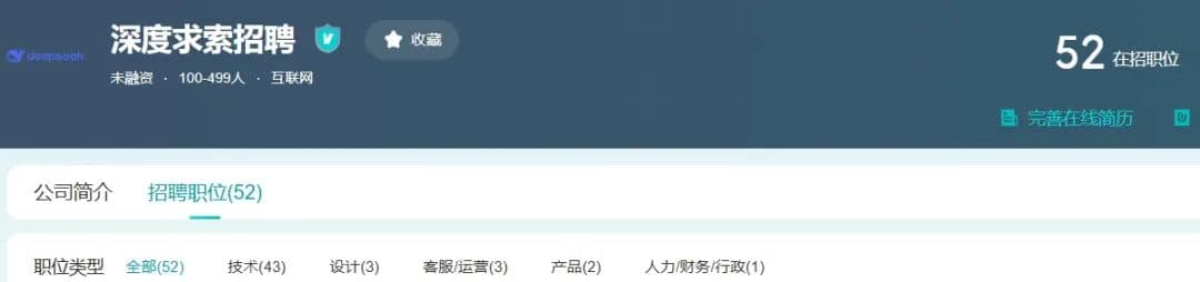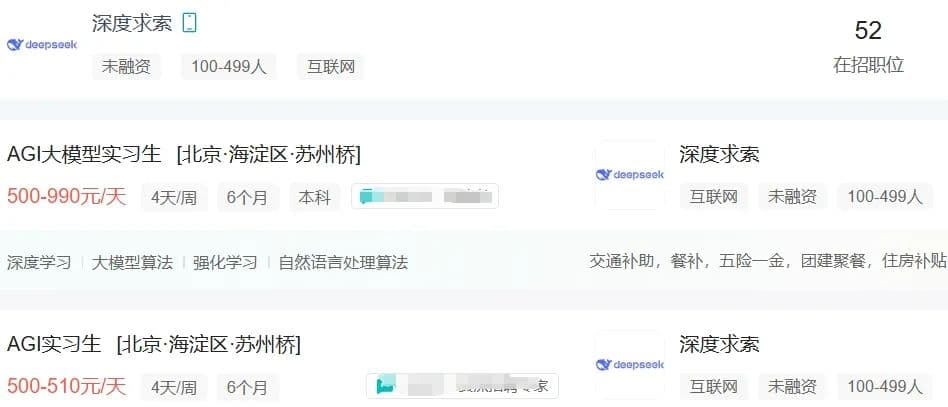 根据公开信息,深度求索公司有52个在招职位,涵盖深度学习研究员、核心系统研发工程师及资深UI设计师等,工作城市是北京或杭州。