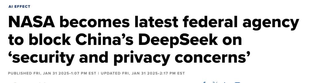 1月31日,CNBC获悉:因「安全和隐私问题」,美国宇航局(NASA)禁止员工使用DeepSeek并封锁该平台访问。