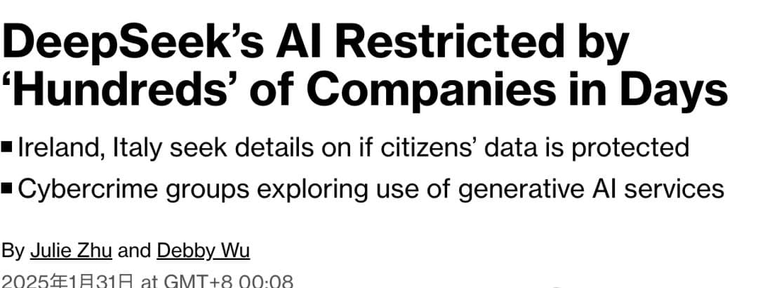 1月31日,彭博报道,已有「数百家」公司(尤其是与政府相关的企业)屏蔽了DeepSeek。