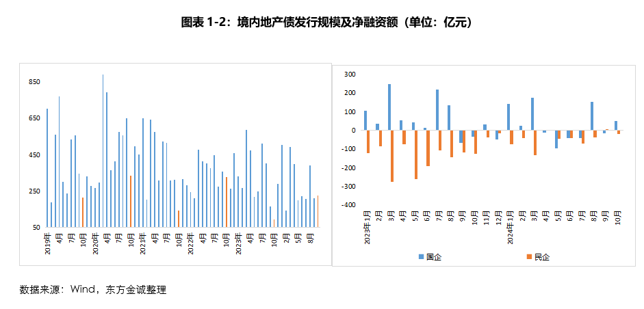 国企净融资额大幅回正,民企发行规模为零。10月国企发行规模为225.5亿元,同比、环比分别增长160.9%和29.2%,到期规模同比增长约44%,但环比下降7%,为178.4亿元,当月国企净融资额大幅回正至47.1亿元;民企方面,或受发行成本提升、发行难度增加等因素影响,当月无民企发行地产债,净融资额再度落入负值区间,当月净融资缺口为20.4亿元。