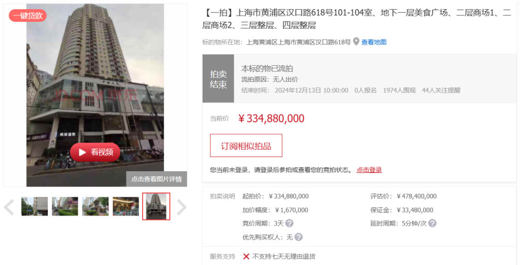 12月13日,据京东资产披露的信息,上海市黄浦区汉口路618号101-104室、地下一层美食广场、二层商场1、二层商场2、三层整层、四层整层(中福大厦)起拍价约3.3488亿元,因无人出价而流拍。标的物评估价约4.78亿元,保证金约3348万元。