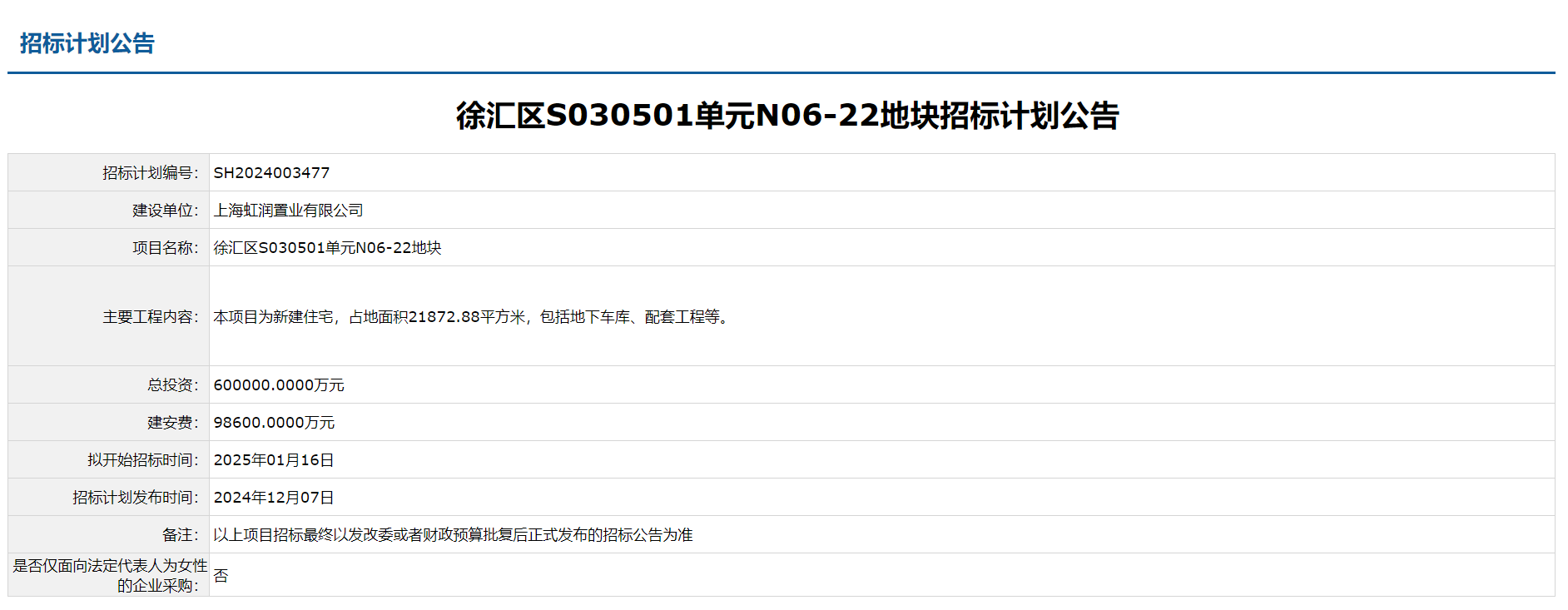 对于徐汇龙华地块,众房企可谓虎视眈眈。上海市建设市场信息服务平台显示,早在12月7日,招商蛇口旗下上海虹润置业有限公司便已发布徐汇区S030501单元N06-22地块招标计划,计划总投资60亿,建安费9.86亿。