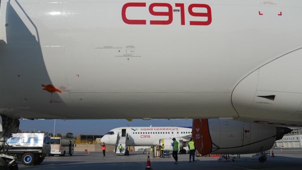 2023年9月17日在乌鲁木齐地窝堡国际机场拍摄的国产大型客机C919。 新华社 资料图