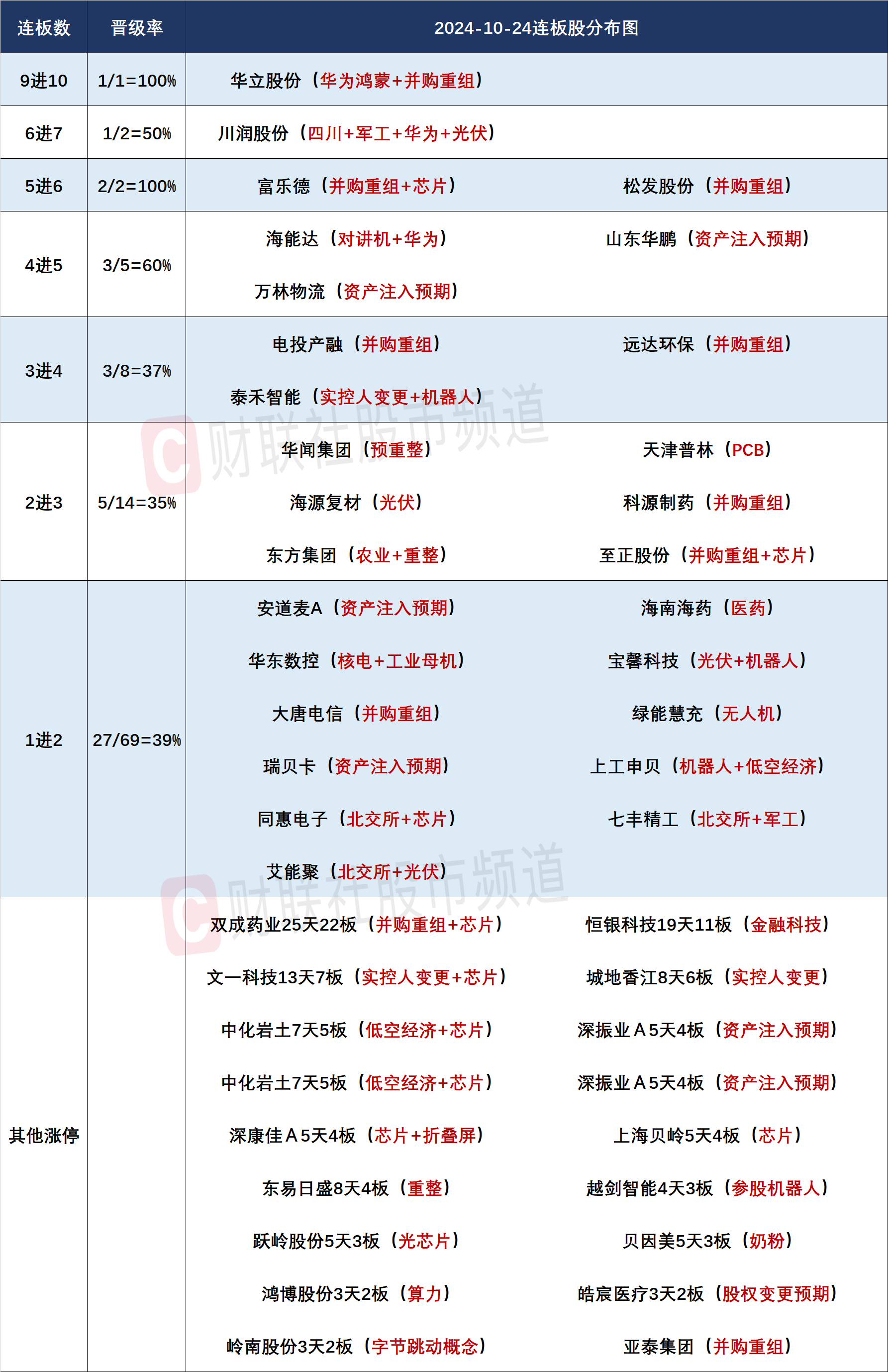 数据显示,9月24日至10月23日,近百家上市公司对外披露资产重组并购事项。10月23日晚,至正股份公告称,拟通过重大资产置换、发行股份及支付现金的方式取得AAMI 的99.97%股权,从而将专注于半导体封装材料和专用设备。昨日跌停后今早继续跌停开的双成药业走出地天板完成逆转,令资金进一步聚焦并购重组方向,除去富乐德实现5进6外,央企半导体并购重组股大唐电信缩量晋级连板并突破前高,万林物流也大长腿涨停完成晋级。不过需注意的是,近期并购重组热度提升的同时,已经蔓延到了部分低位壳资源个股,ST板块今日也迎来批量爆发,超30家个股涨停。因此整个并购重组方向的投机气氛过于浓重后反而要警惕大范围淘汰的来临。